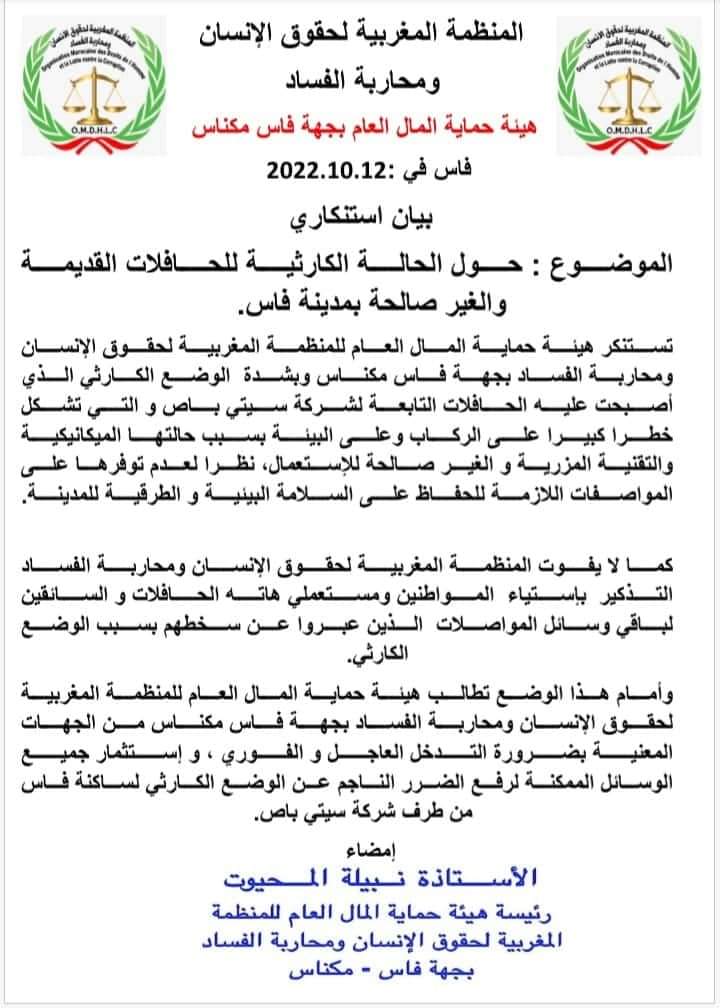 لم تبقى المنظمة المغربية لحقوق الإنسان ومحاربة الفساد بجهة فاس مكناس مكتوفة الأيدي اصدرت بلاغا استنكاريا حول الوضعية الكارثية التي تعيشها مدينة فاس بخصوص النقل الحضري الذي أصبح حديث كل فاسي وذلك راجع للوضعية المزرية التي أصبحت عليها الحافلات المهترئة والتي لا تصلح لنقل الطلبة والتلاميذ والموضفين بل لنقل أشياء أخرى ولهذا وللوقوف بجانب ساكنة فاس اصدرت المنظمة المغربية لحقوق الإنسان ومحاربة الفساد بجهة فاس مكناس كانطلاقة وتعبير على هذه الفضيحة ببيان استنكاري اولي جاء فيه