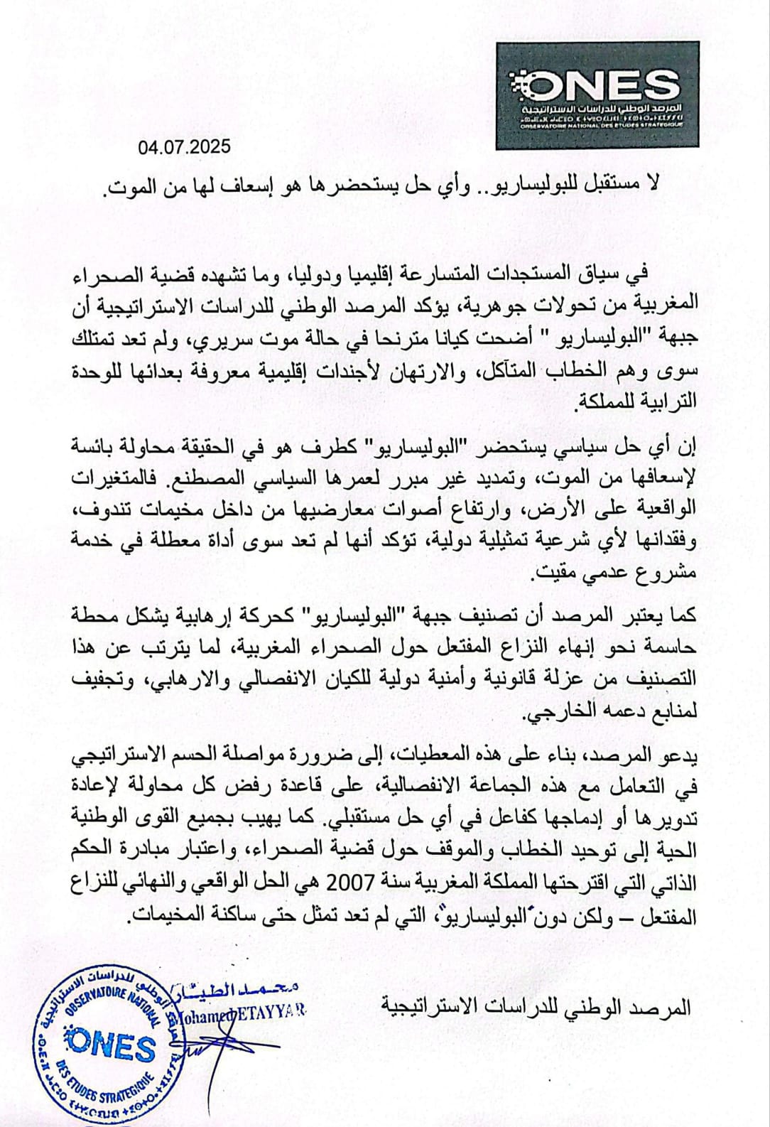 ودعا المرصد، استنادا إلى هذه المعطيات، إلى المضي قدمًا في خيار الحسم الاستراتيجي في التعاطي مع الجبهة الانفصالية، ورفض أي محاولة لإعادة تدويرها أو منحها أدوارا ضمن أية تسوية مستقبلية.