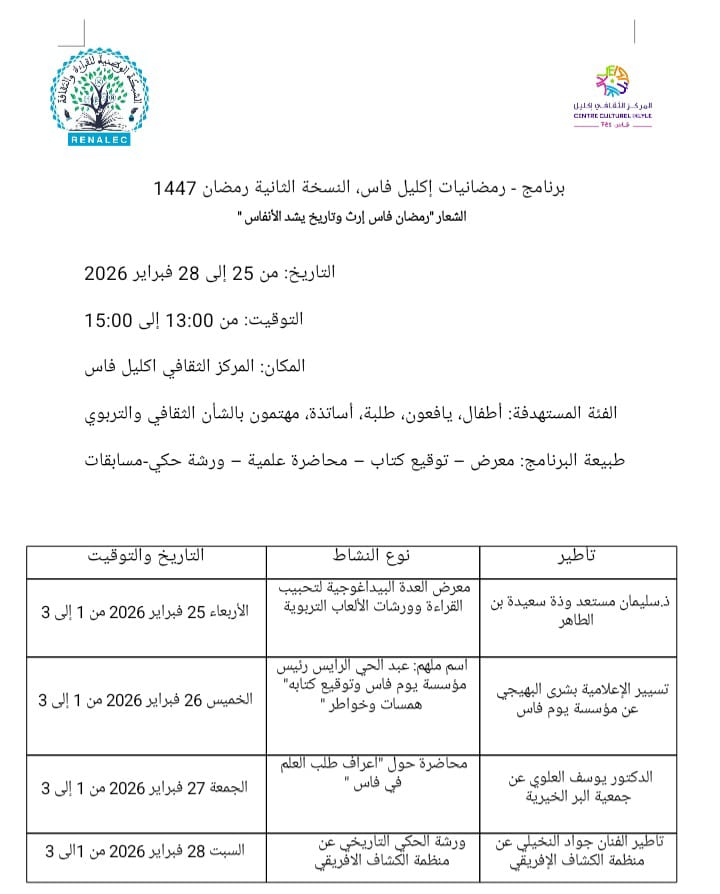 ويقام هذا الموعد الثقافي تحت شعار: “رمضانيا فاس إرث وتاريخ يشد الأنفاس”، في أجواء تجمع بين المعرفة والإبداع والتفاعل التربوي، مستهدفا الأطفال واليافعين والطلبة والأساتذة، إلى جانب المهتمين بالشأن الثقافي والتربوي.
