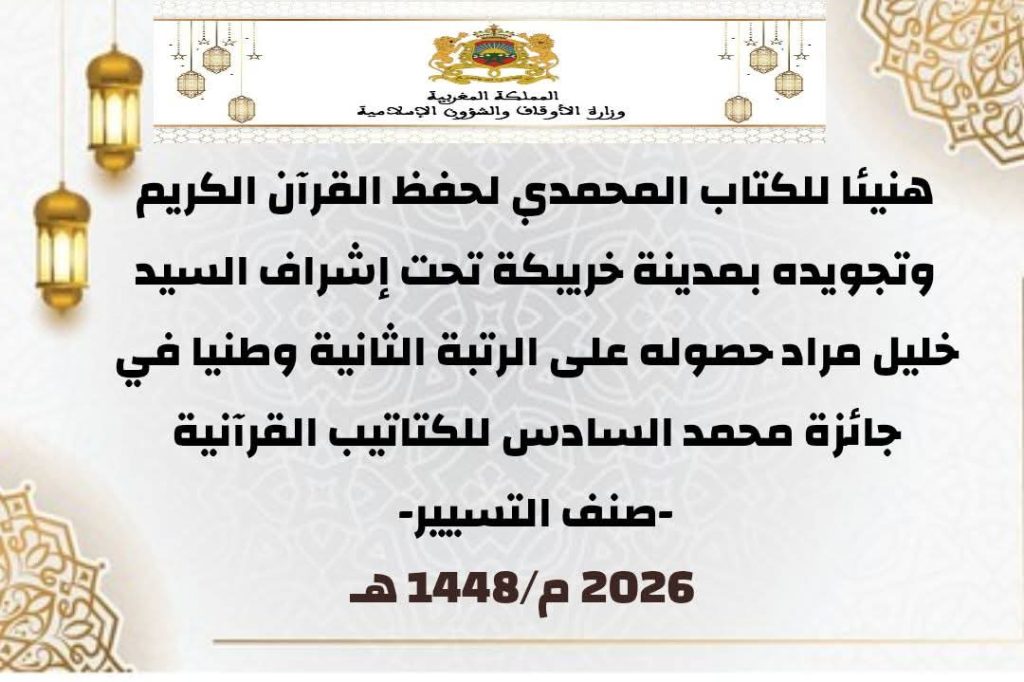 يظل حفظ القرآن الكريم من أنبل المسارات التي تصنع الإنسان وتبني القيم وتُرسّخ الهوية. ومن مدينة خريبكة، يسطع نور جديد يبعث على الفخر والاعتزاز، بعد أن تمكن الكتاب المحمدي لحفظ القرآن الكريم وتجويده من تحقيق إنجاز وطني متميز، بحصوله على الرتبة الثانية وطنيًا في جائزة محمد السادس للكتاتيب القرآنية – صنف التسيير، برسم سنة 2026/1448هـ، تحت إشراف السيد خليل مراد.