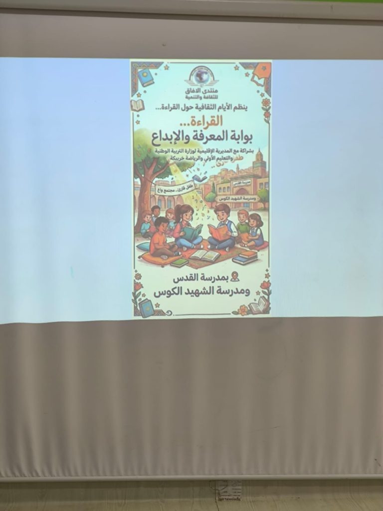 ويُذكر أن هذا المشروع من تنظيم منتدى الآفاق للثقافة والتنمية بشراكة مع المديرية الإقليمية لوزارة التربية الوطنية والتعليم الأولي والرياضة بخريبكة، ويشمل في مرحلته الحالية مدرستي القدس والشهيد الكوس ، على أن يتم تعميمه مستقبلًا ليشمل مختلف المؤسسات التعليمية الابتدائية، في إطار رؤية تربوية تروم تعزيز ثقافة القراءة وإعادة الاعتبار للكتاب داخل المدرسة المغربية.