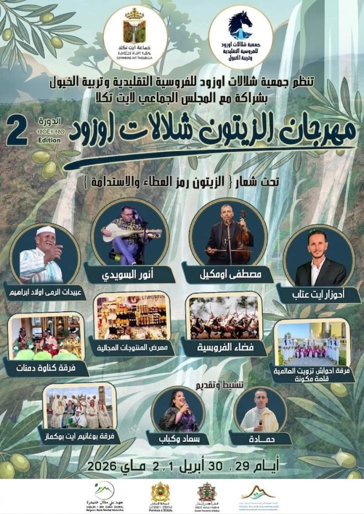 تستعد جماعة آيت تڭلا، بإقليم أزيلال، لاحتضان فعاليات الدورة الثانية لـ “مهرجان الزيتون لشلالات أوزود”، وذلك في الفترة الممتدة ما بين 29 أبريل و2 مايو 2026. وينظم هذا الحدث من طرف “جمعية شلالات أوزود للفروسية التقليدية وتربية الخيول” بشراكة مع المجلس الجماعي لآيت تڭلا، بهدف تسليط الضوء على المؤهلات الطبيعية والثقافية التي تزخر بها المنطقة.