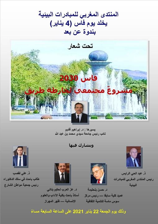يخلد المنتدى المغربي للمبادرات البيئية يوم فاس (4 يناير) في دورته الحادية عشرة بندوة عن بعد اليوم الجمعة 22يناير 2021 بمشاركة فعاليات جمعوية وجامعية تحت شعار: ” فاس2030″ “مشروع مجتمعي لخارطة طريق”